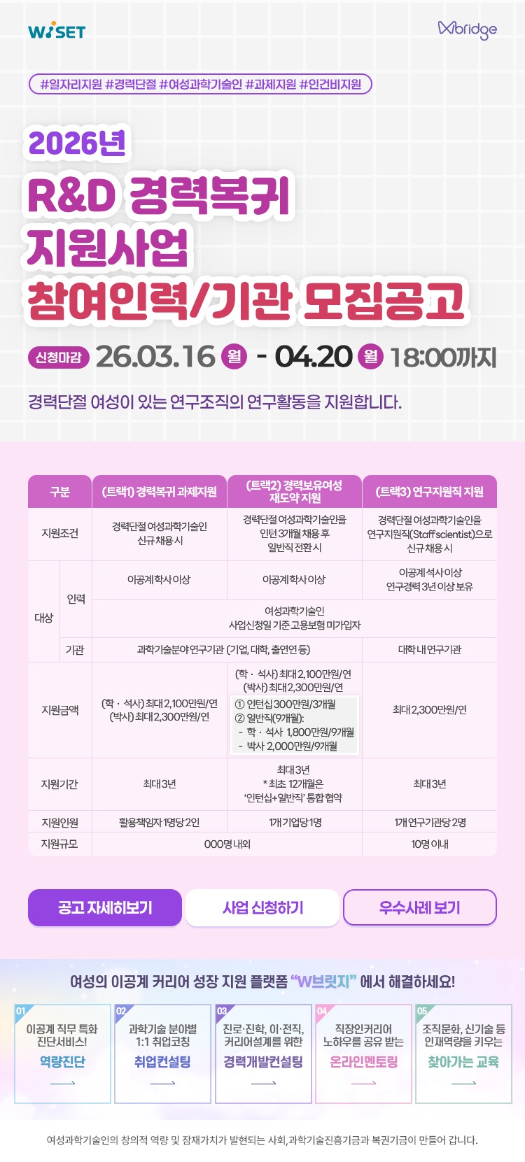 [WISET] 여성과학기술인 R&D 경력복귀 지원사업 상반기 모집 공고(~4/20)